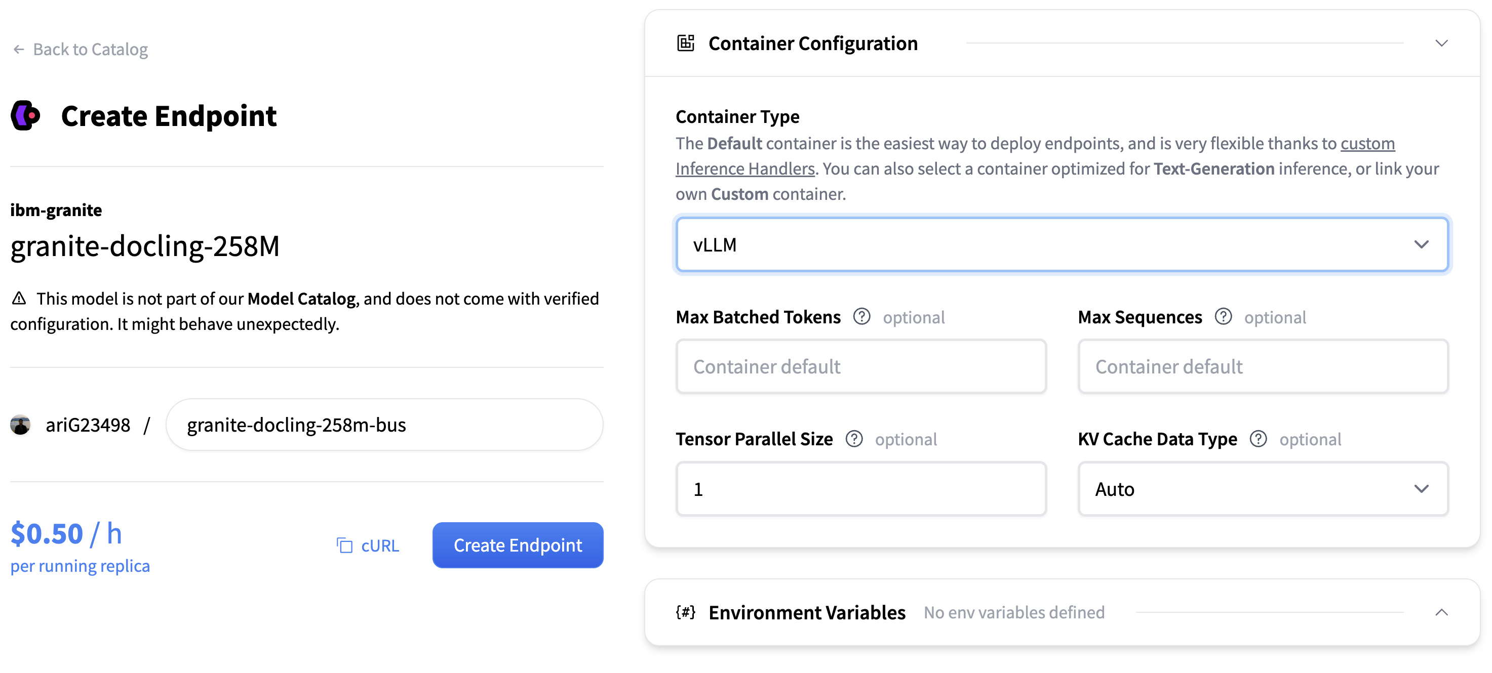 needed). You can then use your endpoint programmatically or via the SDK.# pip install openai from openai import OpenAI import os client = OpenAI( base_url = DEPLOYMENT_URL, api_key = os.environ["HF_TOKEN"] # https://huggingface.co/settings/tokens ) chat_completion = client.chat.completions.create( model = "ibm-granite/granite-docling-258M", messages = [ { "role": "user", "content": [ { "type": "image_url", "image_url": { "url": "https://huggingface.co/ibm-granite/granite-docling-258M/resolve/main/assets/new_arxiv.png" } }, { "type": "text", "text": "Convert this page to docling." } ] } ], stream = True ) for message in chat_completion: print(message.choices[0].delta.content, end = "")
